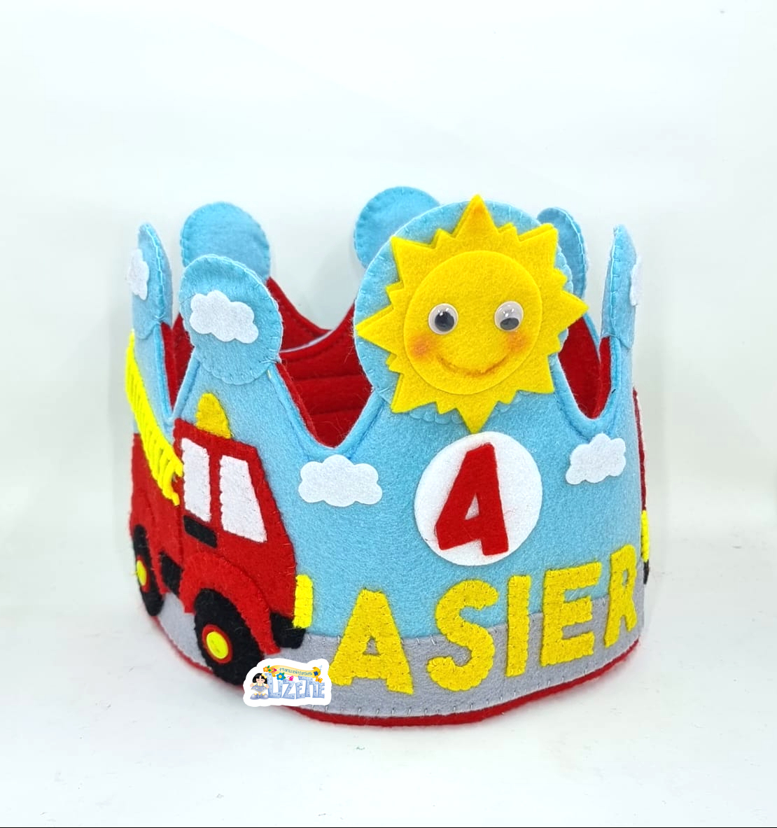 Esta adorable corona está hecha a mano en suave fieltro azul y rojo, con un simpático camión de bomberos listo para la acción y un solecito sonriente que ilumina cualquier celebración. Nubes esponjosas, carretera y detalles coloridos completan este diseño pensado para pequeños héroes y heroínas que sueñan con salvar el día.