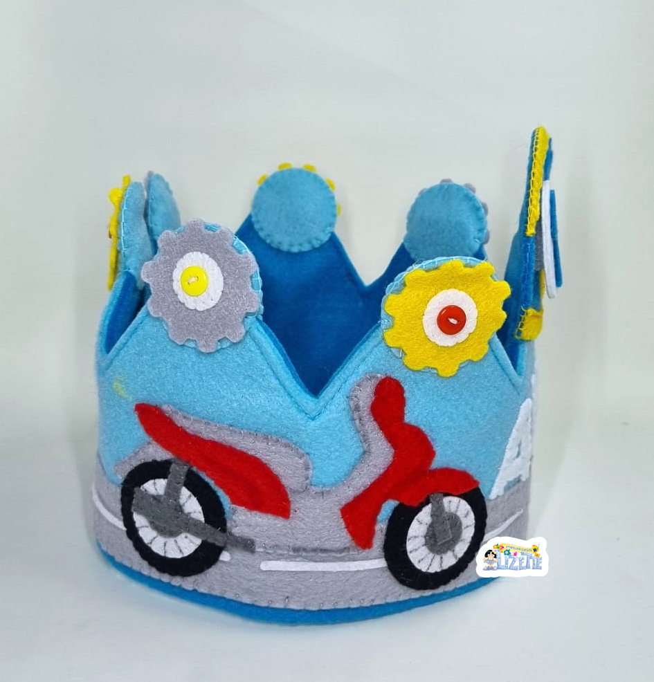 Ideal para los pequeños amantes de las dos ruedas, esta corona de cumpleaños hecha a mano en suave fieltro azul combina diversión y velocidad en un diseño lleno de detalles. Con una moto roja lista para rodar, engranajes de colores y un estilo alegre, es perfecta para encender la imaginación y la emoción del día especial.