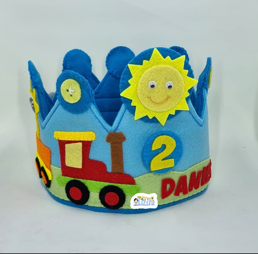 Perfecta para pequeños aventureros, esta corona de cumpleaños hecha a mano en suave fieltro azul combina la alegría de un colorido tren con la calidez de un sol sonriente. Los detalles como ruedas, botones decorativos y colores vivos llenan el diseño de energía y diversión.