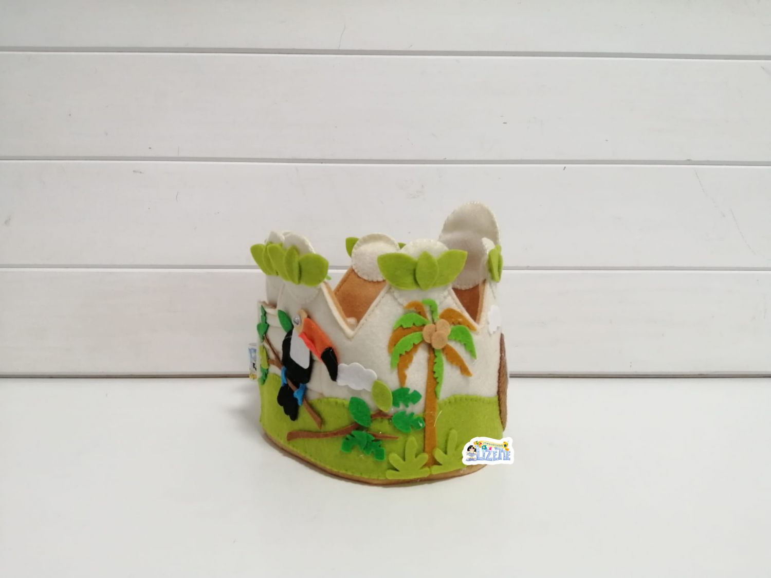 Decorada con palmeras, hojas exóticas y un simpático tucán, esta corona es perfecta para pequeños exploradores que aman la naturaleza y los animales.