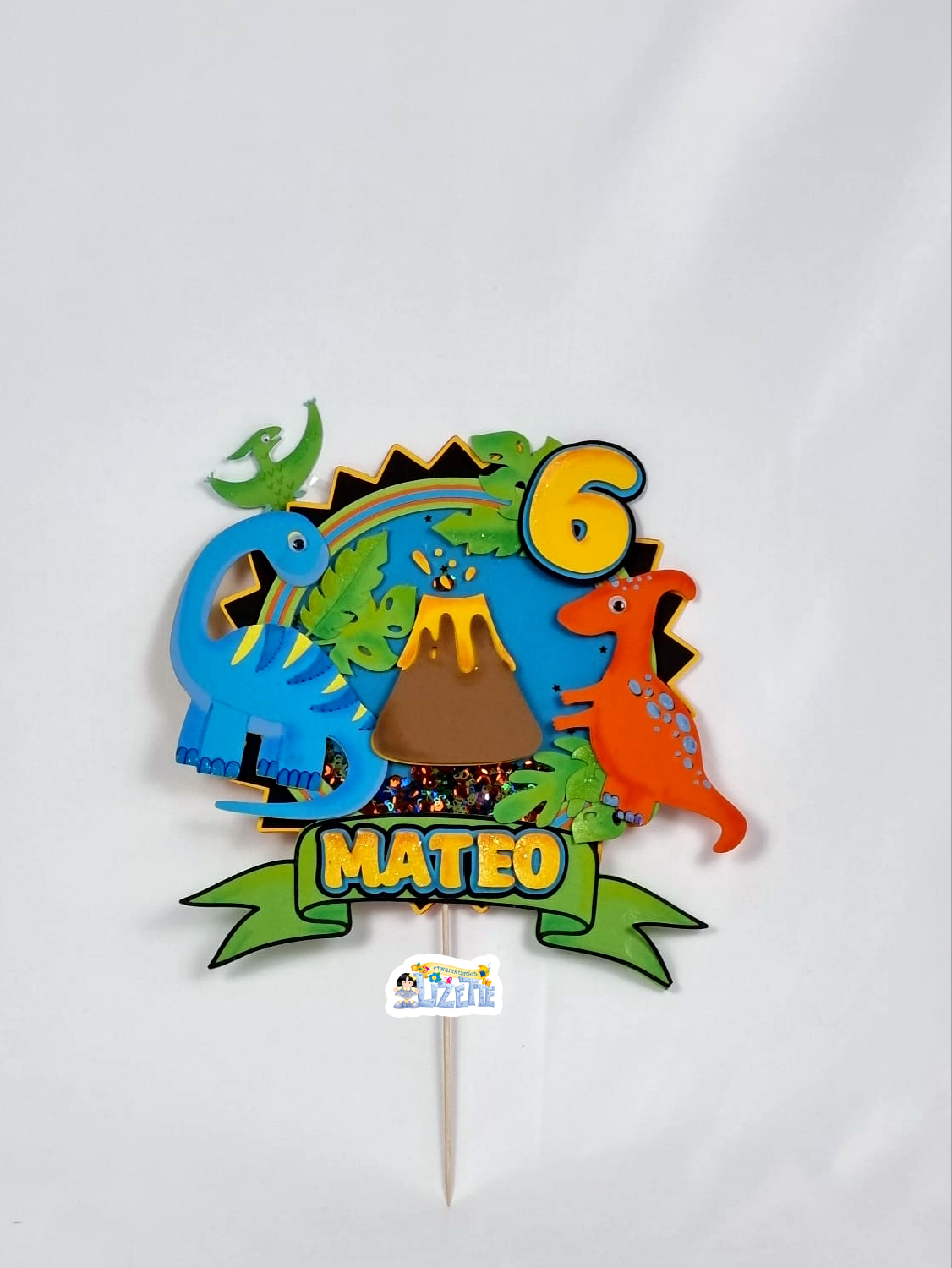 Convierte el pastel de tu pequeño en una aventura prehistórica con este cake topper de dinosaurios personalizado.