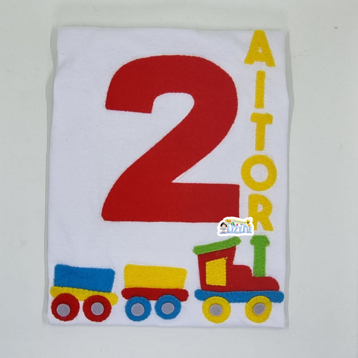 El diseño incluye un gran número 2 en color rojo, acompañado de un divertido tren de colores con vagones y el nombre del niño (en este caso Aitor), lo que la convierte en una prenda única y llena de alegría.