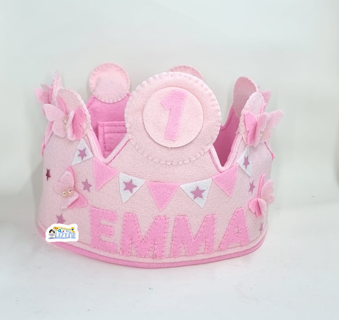 Celebra su primer añito con esta hermosa corona infantil de fieltro, hecha a mano en suaves tonos rosados.