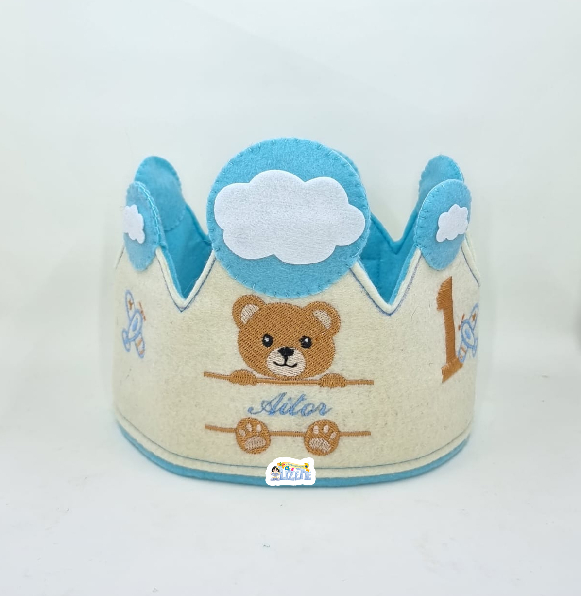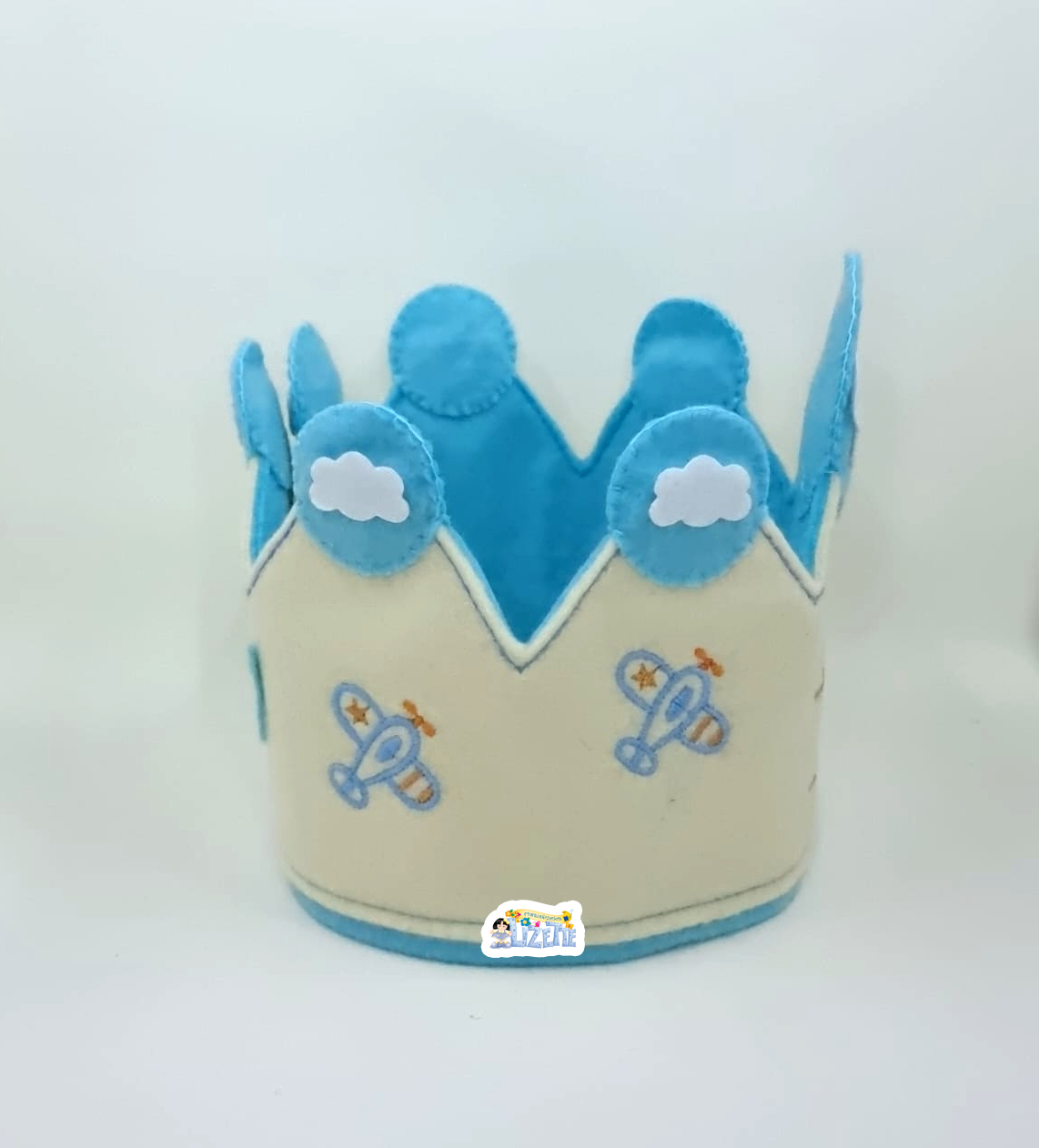 Delicada corona infantil confeccionada en fieltro suave y bordada a máquina, ideal para niños de 1 y 2 años.