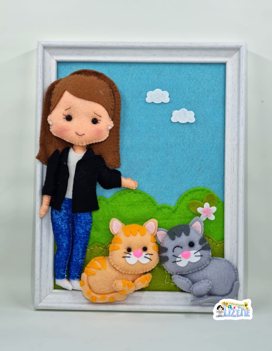 Este precioso marco personalizado de fieltro es la manera más especial de capturar recuerdos familiares. Hecho totalmente a mano, representa a tu familia y mascotas en adorables muñecos de fieltro, creando una pieza única de decoración llena de ternura y personalidad.