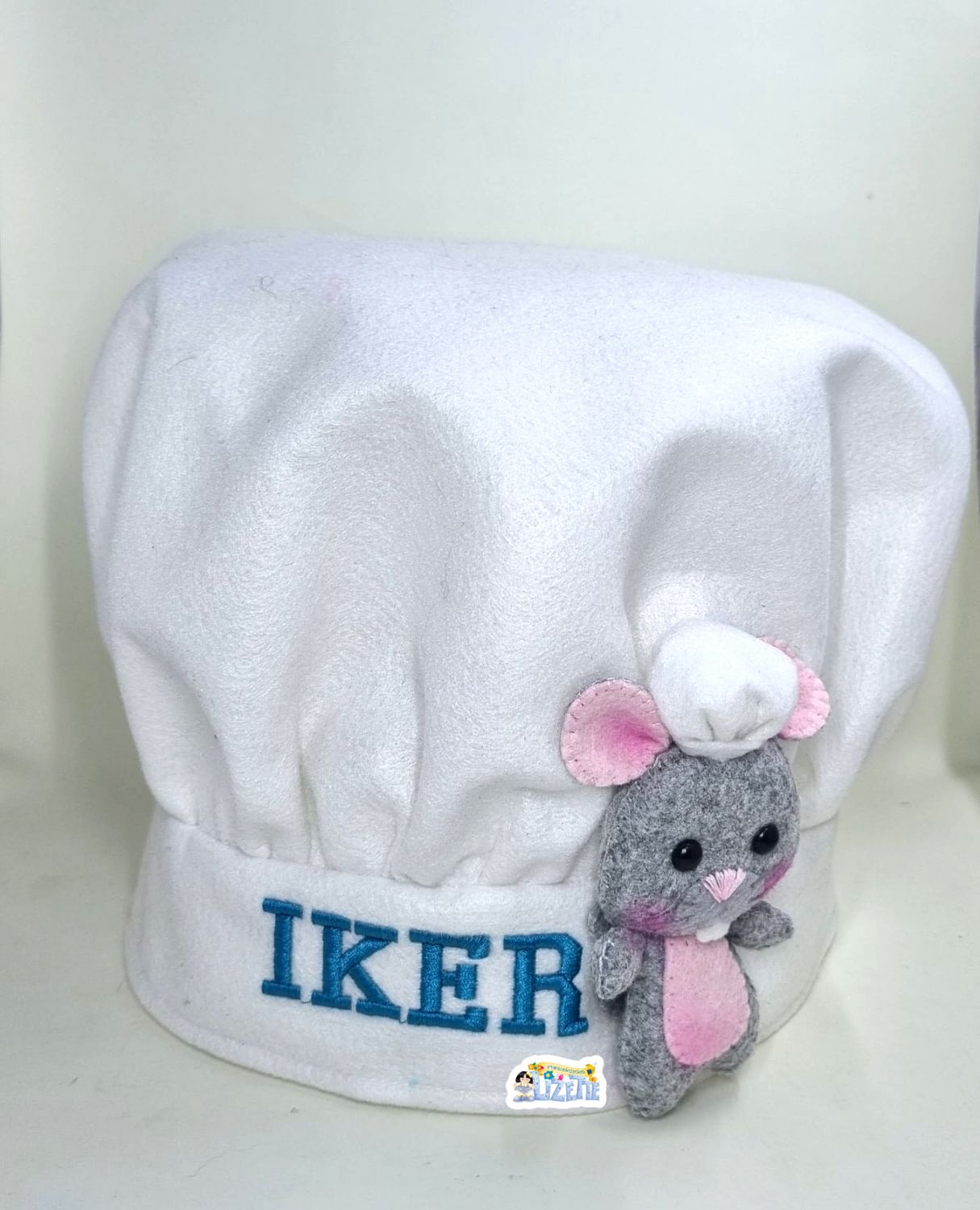 El gorro de chef destaca por su diseño clásico en color blanco, decorado con un adorable ratoncito cocinero en fieltro, que aporta un toque tierno y divertido. Incluye bordado personalizado con el nombre del niño, lo que lo convierte en un accesorio exclusivo y especial.