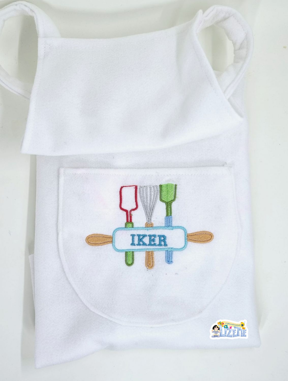 El delantal de chef combina funcionalidad y diseño. Cuenta con tirantes cómodos, un bolsillo frontal amplio y un delicado bordado de utensilios de cocina junto al nombre personalizado, perfecto para estimular el juego creativo y el amor por la cocina.