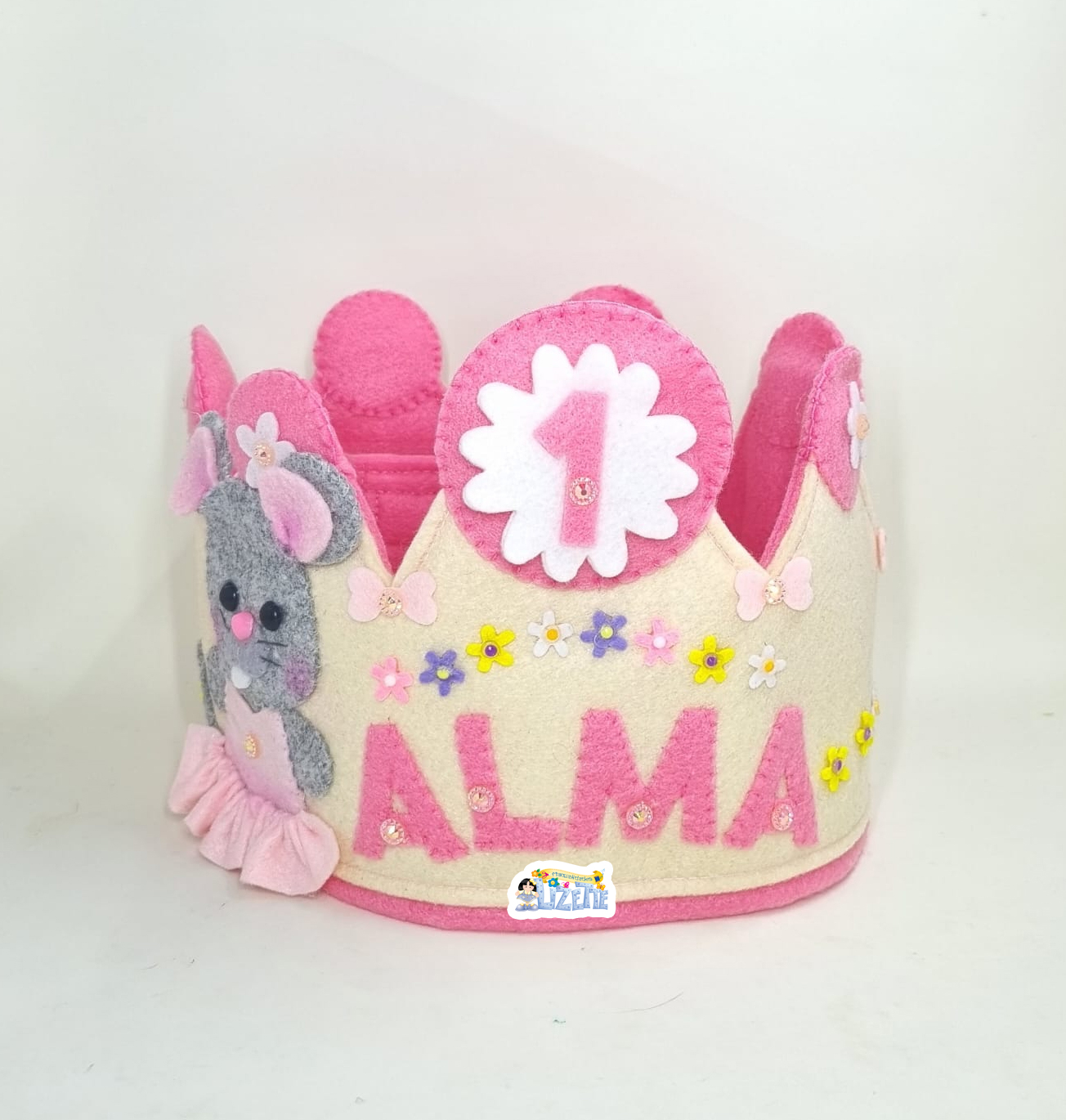 La corona presenta un delicado diseño de ratoncita princesa, acompañada de detalles florales, mariposas y aplicaciones decorativas que le dan un estilo dulce y encantador. Su combinación de tonos rosa y crema la hace perfecta para celebraciones infantiles, especialmente cumpleaños.