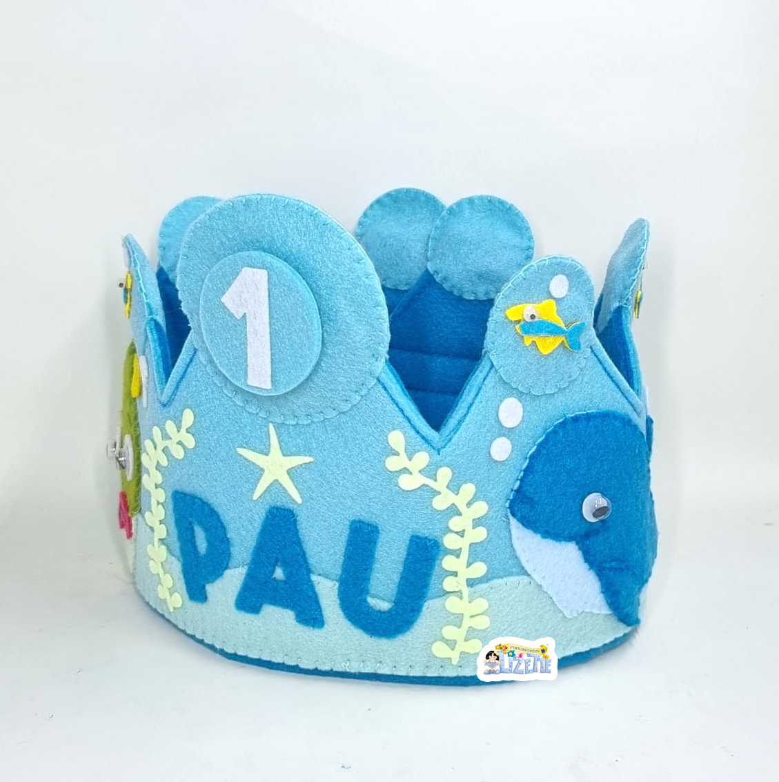 Original corona de cumpleaños infantil en fieltro con temática Mundo Marino, personalizada con el nombre del niño y su edad.
