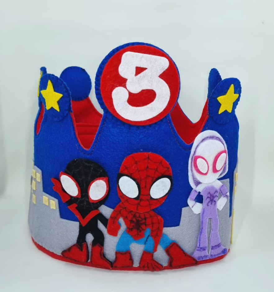 Hermosa corona artesanal en fieltro, inspirada en el universo de Spiderman, ideal para celebrar cumpleaños infantiles con un toque único y especial.