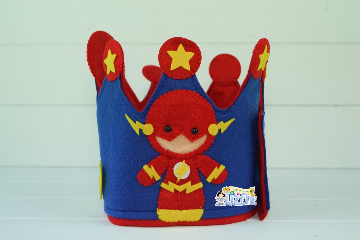Hermosa corona artesanal en fieltro, inspirada en el universo de Flash, ideal para celebrar cumpleaños infantiles con un toque único y especial.